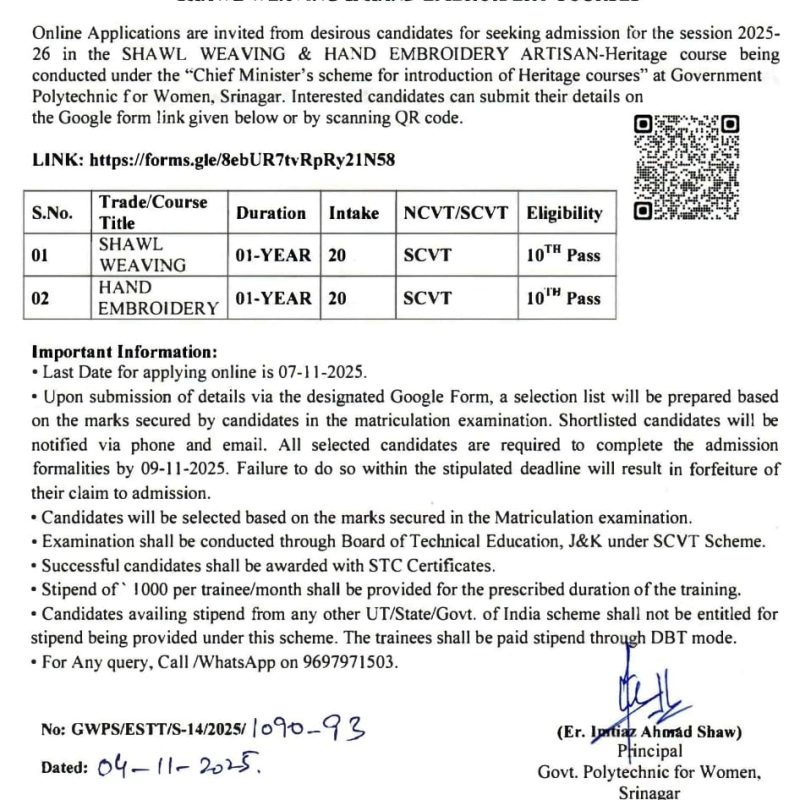 ADMISSION NOTICE 01 OF 2025 FOR SHAWL WEAVING & HAND EMBROIDERY COURSES